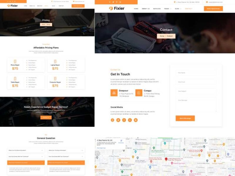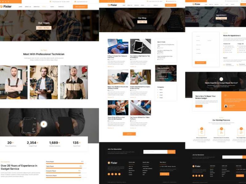 The Fixier repair website boasts a professional and modern design that reflects the cutting-edge nature of electronics repair services. With over 16 pre-built templates, including pages such as Home, About Us, Services, Appointment, Pricing, Our Team, FAQ, Blog, Single Blog, Contact, MetForm Appointment, MetForm Contact, 404 Page, Header, Footer, and Global Theme Style, setting up a comprehensive and engaging website is straightforward and efficient.
